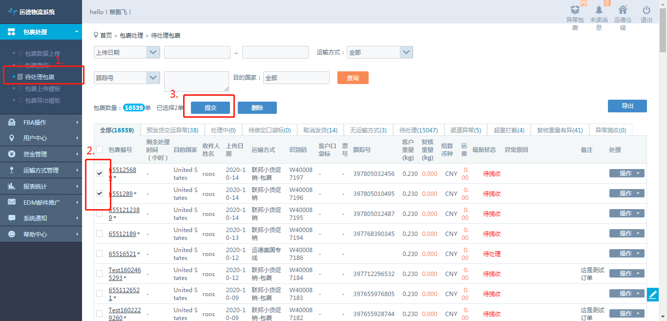 3.待处理包裹--待处理--勾选--提交--完成下单